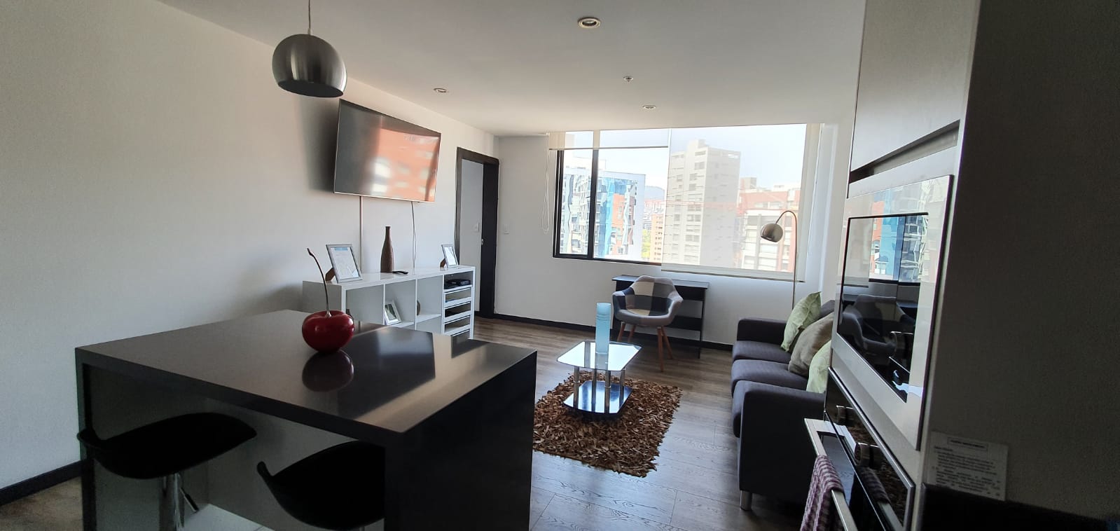 Elegante suite en edificio inteligente con excelentes servicios comunales. Piso 10 con hermosa vista. La cocina cuenta con electrodomésticos modernos y de gran calidad. Una Tv de 90” en la sala, Dormitorio con baño privado, cama Queen. Baño social, lavadora secadora. Parqueadero