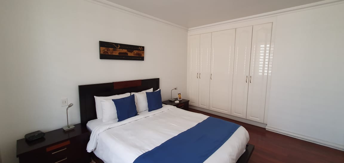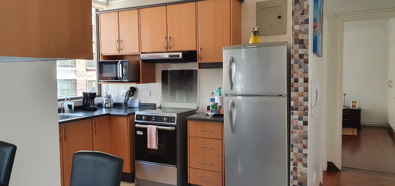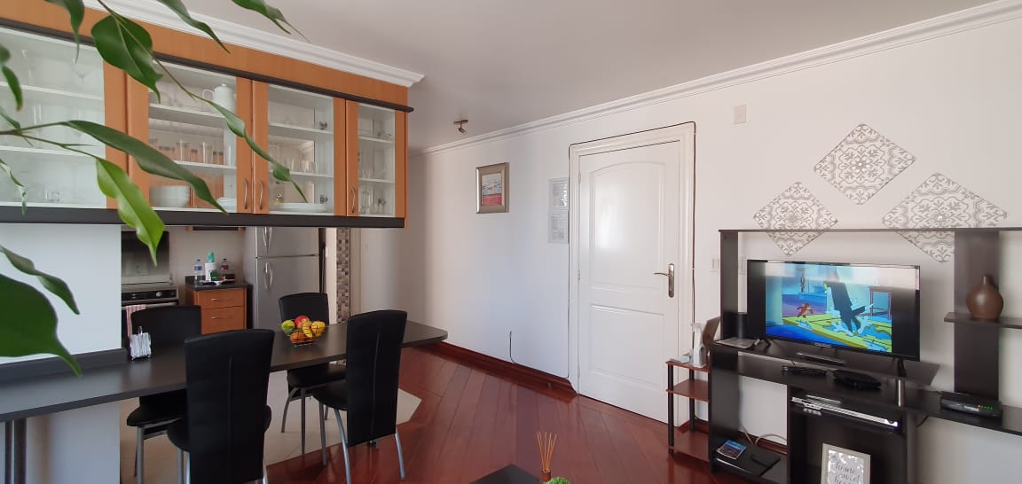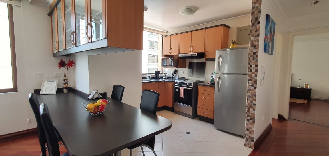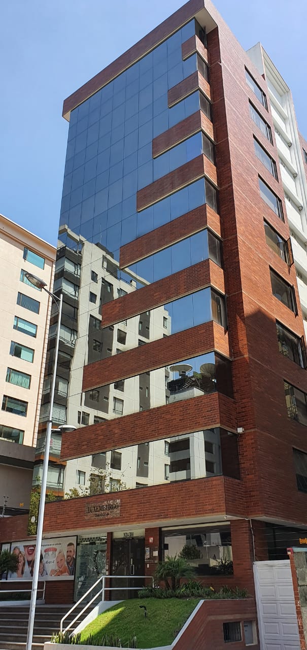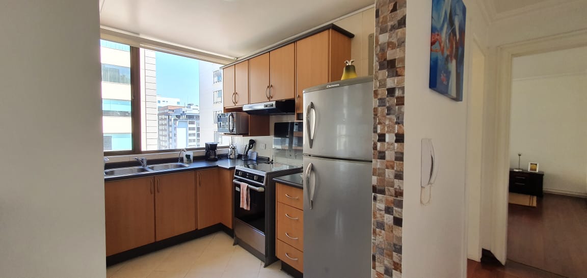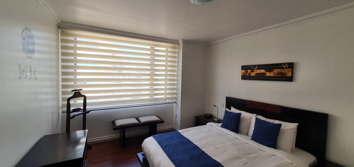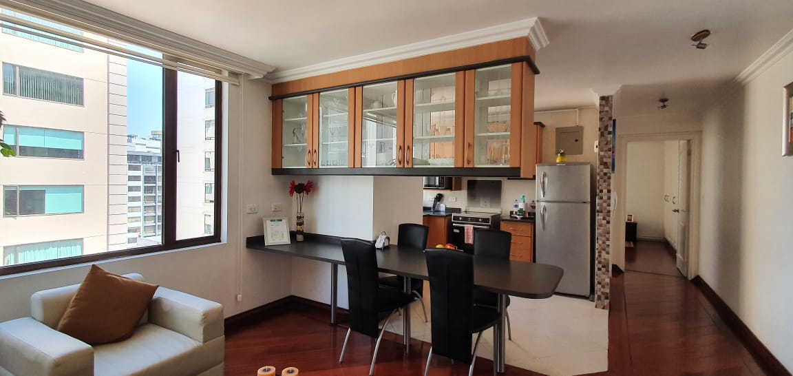 Elegante y moderna suite ubicada en la calle Luxemburgo y Portugal, muy cerca del Parque La Carolina. Piso 8, Vista a la calle. Decoración Moderna. Sala, cocina tipo americano con mesón desayunador para 4 personas, menaje completo. lavadora y secadora en área comunal. Dormitorio con cama Queen, Tv con canales de Cable. Parqueadero.
