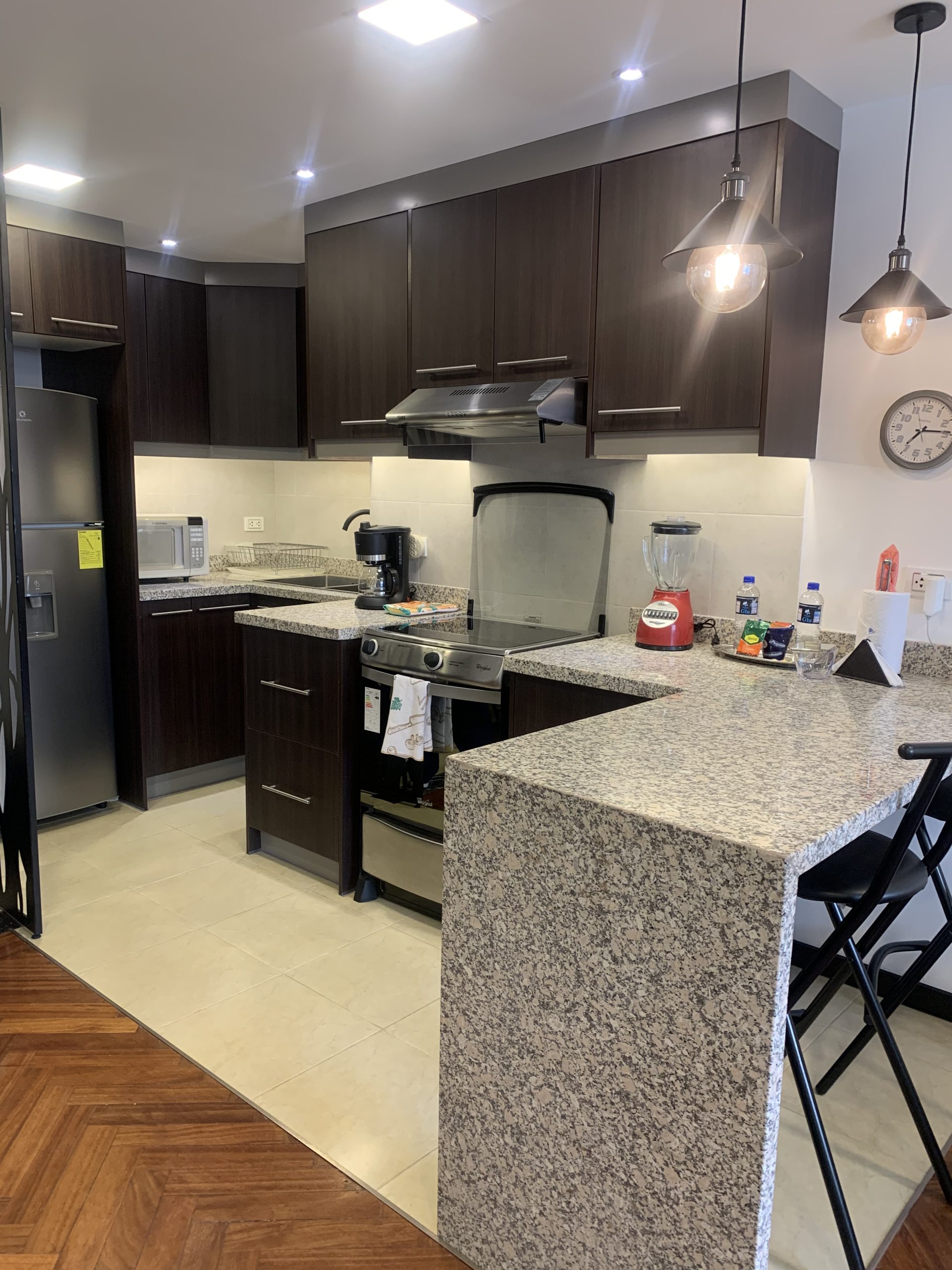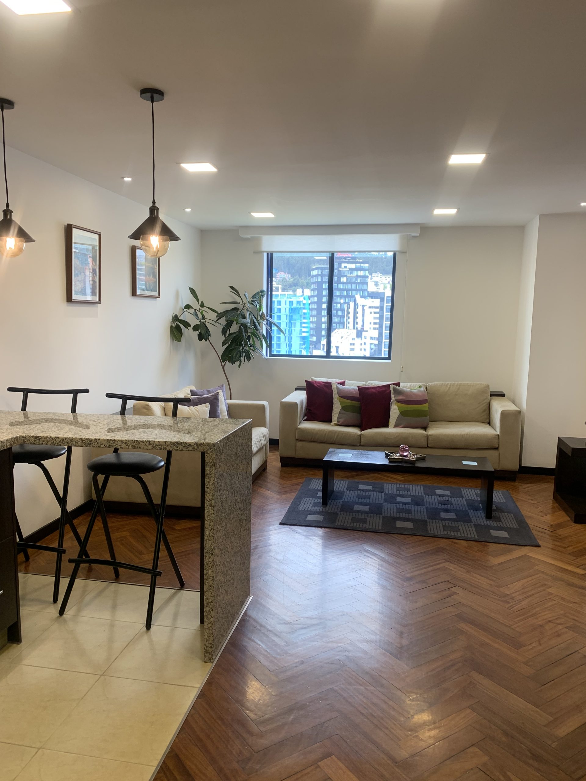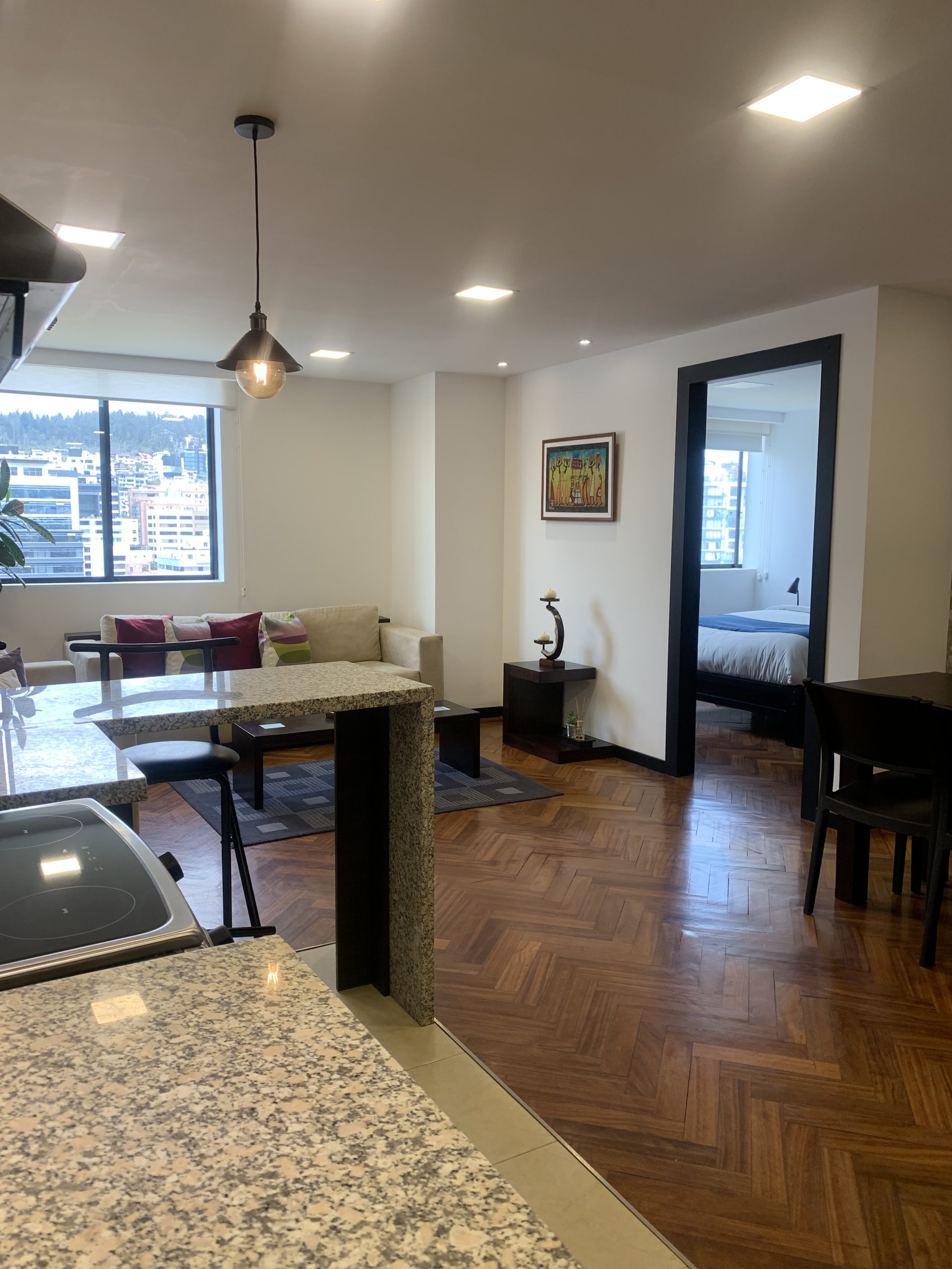 Nuestra suite junior esta ubicada en la Av. Republica del Salvador y Portugal, a pocos pasos del Parque La Carolina. Piso 11. Con una hermosa vista desde el dormitorio master y mucha luz. Sala, comedor con 4 puestos, cocina con menaje completo. Dormitorio con cama Full. Parqueadero. El Edificio cuenta con piscina, gimnasio y terraza comunal. La lavadora y secadora son comunales (de pago)
